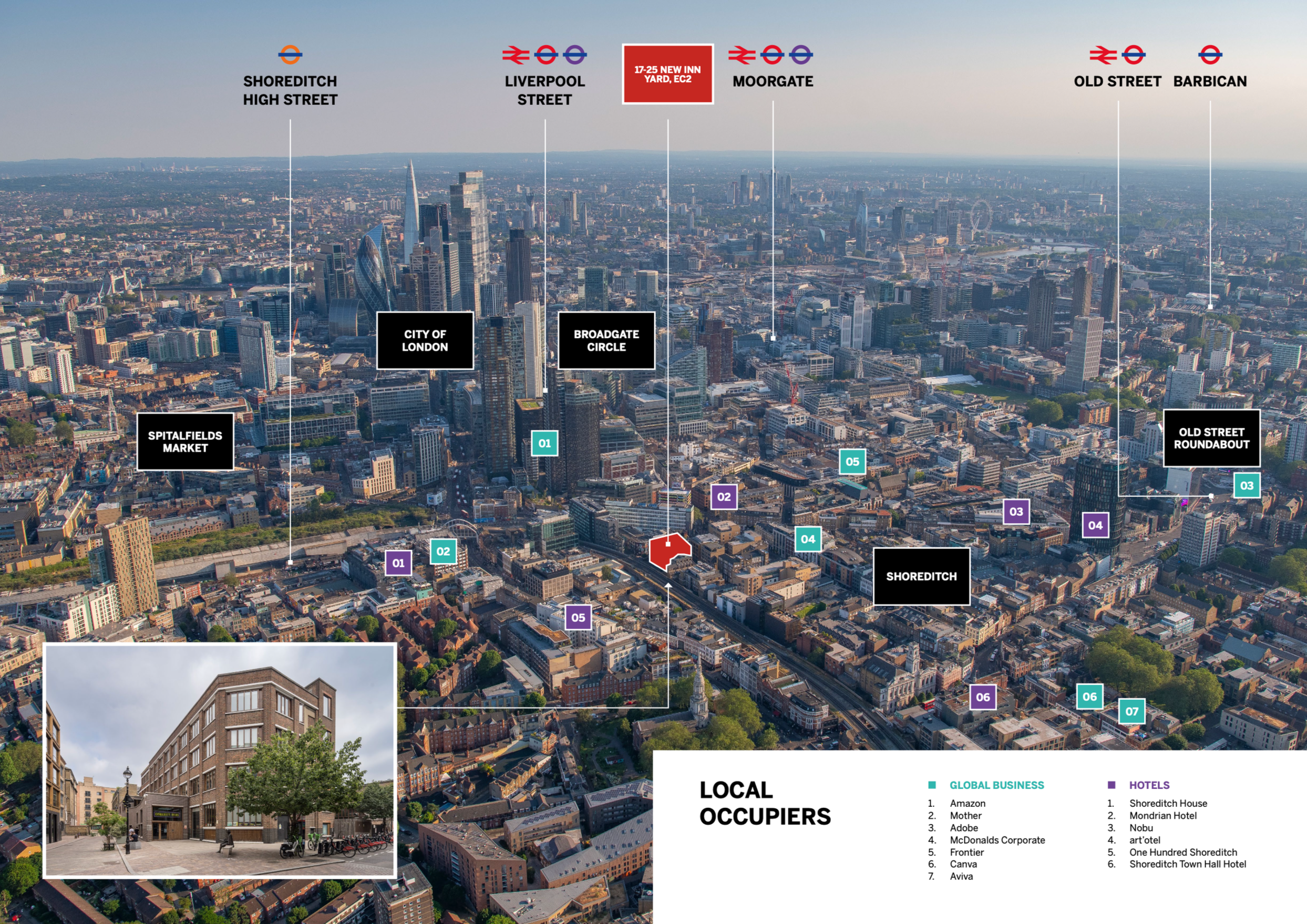 New Inn Yard is positioned in the heart of Shoreditch, moments from Old Street’s Silicon Roundabout and within immediate reach of Liverpool Street and the City of London. The building sits at the intersection of London’s established technology cluster and its financial core, placing it within one of the capital’s most resilient and sought-after commercial submarkets.